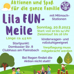 Der Lila Fun-Meile-Sonntag wird heiß - aber keine Sorge - es gbt immer wieder Schatten und Bänke zum Verweilen. Und am Schluss gibt es die Möglichkeit am Fleinsbach zu plantschen - einfach genug zu trinken mitbringen! Die Tour dauert ca. 2 Stunden!