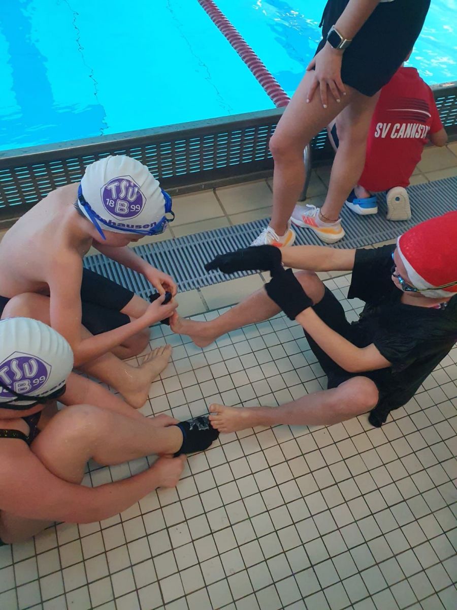 Für uns Hechte gab es auch ein ganz besonderes Staffelhighlight! Es fand eine Kleiderstaffel statt: der erste Schwimmer trägt ein T-Shirt trägt, der zweite Schwimmer hat bereits Socken an und muß zusätzlich das T-Shirt des ersten Schwimmers anziehen. Der dritte Schwimmer hat Handschuhe an und muß vom zweiten Schwimmer T-Shirt und Socken anziehen. Der vierte Schwimmer hat passend zum ersten Advent eine Nikolausmütze an und muß vom dritten Schwimmer das T-Shirt, die Socken und die Handschuhe anziehen. Hier ging es sehr turbulent und hektisch zu. Trotzdem konnten wir mit hervorragender Zeit (Umzieh- und Schwimmzeit) von 03:29,17 Minuten den dritten Platz erzielen.