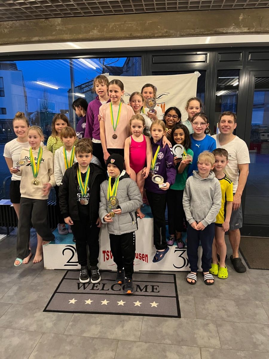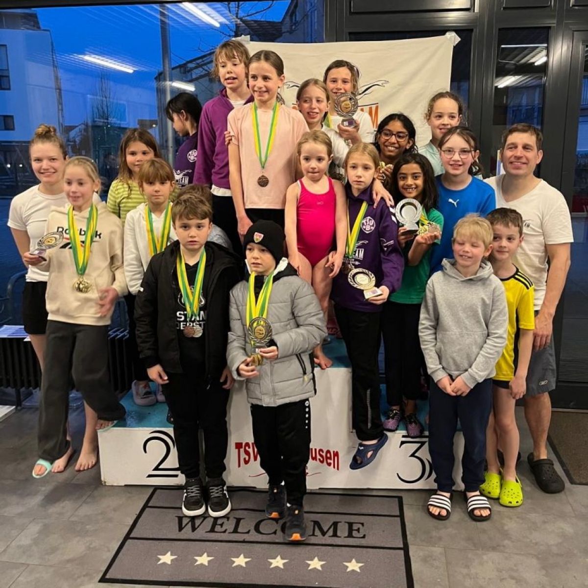 Bei der 4x50m Freistil Staffel gab es ein Doppelpodest für den TSV, die erste Mannschaft mit Max, Luana, Fabian und Julia schwamm auf den ersten Platz und die 2. Mannschaft mit Laura, Amaira, Swara und Lena W. auf den 3. Platz. Bei der 4x50m Lagen Staffel erreichten Larissa, Luana, Lena G. und Max den 2. Platz. Insgesamt erzielten unsere jungen Schwimmerinnen und Schwimmer viele neue Bestzeiten und nahmen mehrere Medaillen mit nach Hause.