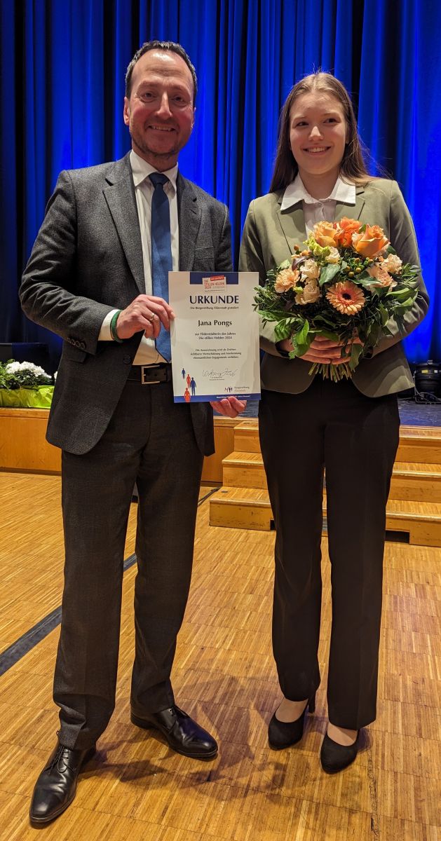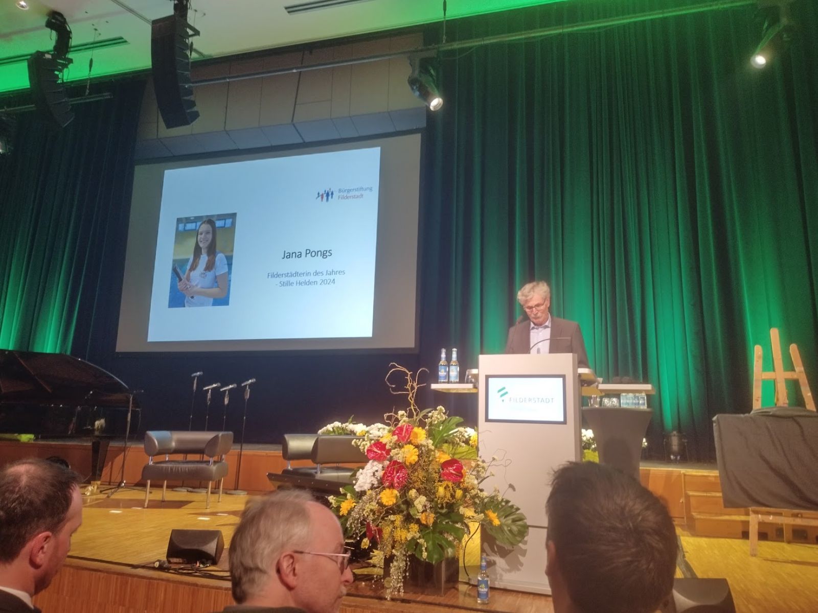 Die Bürgerstiftung möchte mit den „Stillen Helden“ Personen danken, die sich sehr ehrenamtlich engagieren und somit Bandbreite für ehrenamtliches Engagement bieten. Wir sind sehr stolz, dieses Jahr eine Stille Heldin aus dem TSV zu haben. Jana Pongs, Trainerin in der Schwimmabteilung, wurde zur Stillen Heldin geehrt. Die gerade mal 18-jährige Trainerin steht mindestens 3 mal die Woche im Schwimmbad und gibt Schwimmtraining. Zudem kommen die ganztägigen Wochenendeinsätze auf den Wettkämpfen. Sie hat bei uns in der Schwimmabteilung mit 6 Jahren angefangen selber zu schwimmen. Mit 12 Jahren begann sie bei den Freizeitgruppen den Trainern zu assistieren. Seit 2021 half sie bei der Nachwuchswettkampfgruppe mit und seit 2022 trainiert sie diese alleine in voller Verantwortung.