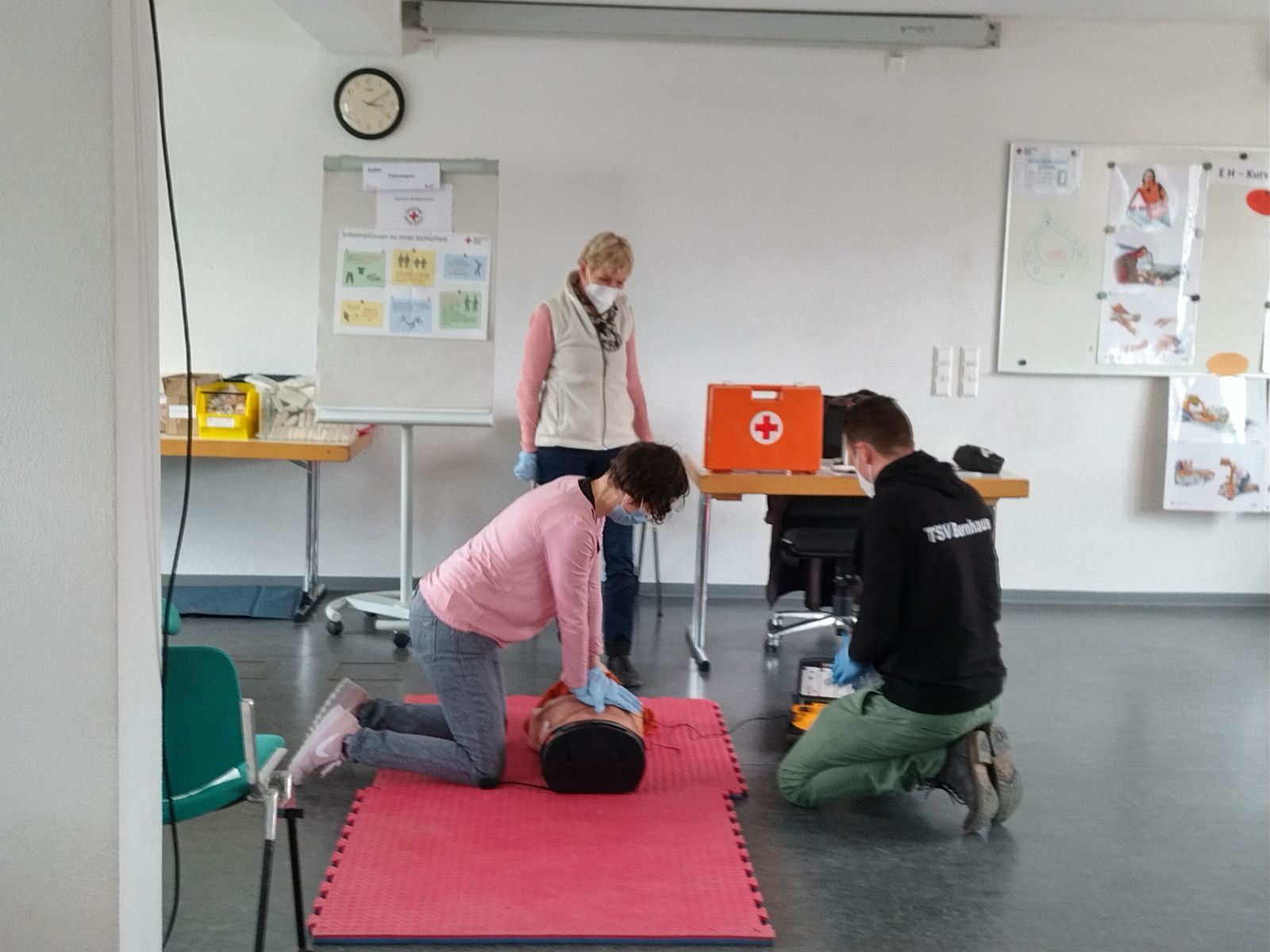 um ihr Wissen in Sachen Erste Hilfe aufzufrischen. Kursleiterin und TSV Mitglied Edith Fehrmann führte kurzweilig durch den Tag, der mit vielen praktischen Übungen gefüllt war. Natürlich wurden alle Corona-Regeln eingehalten, der Tag begann mit einem Schnelltest!